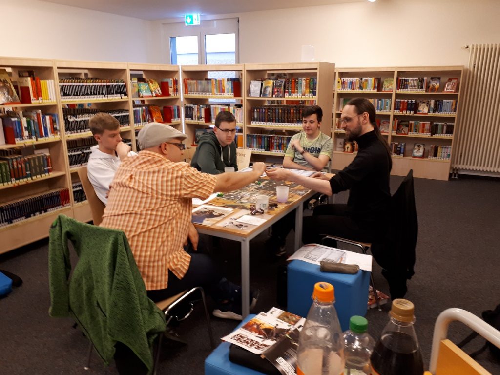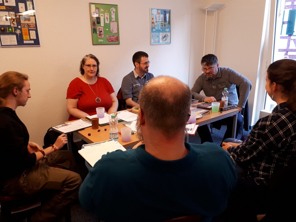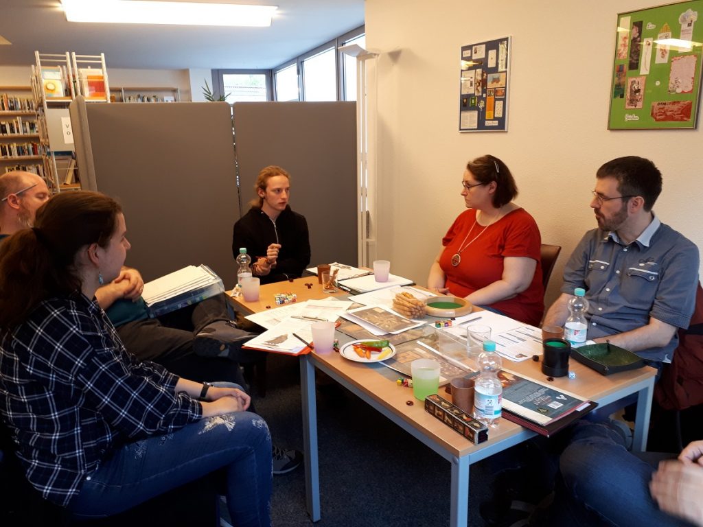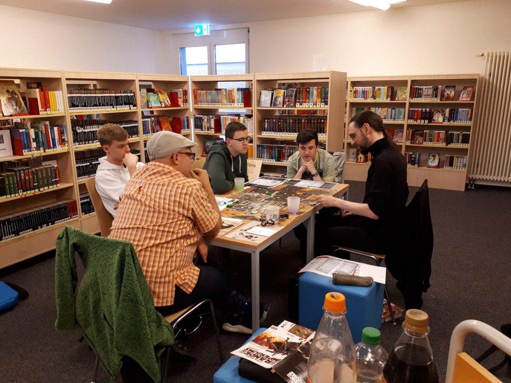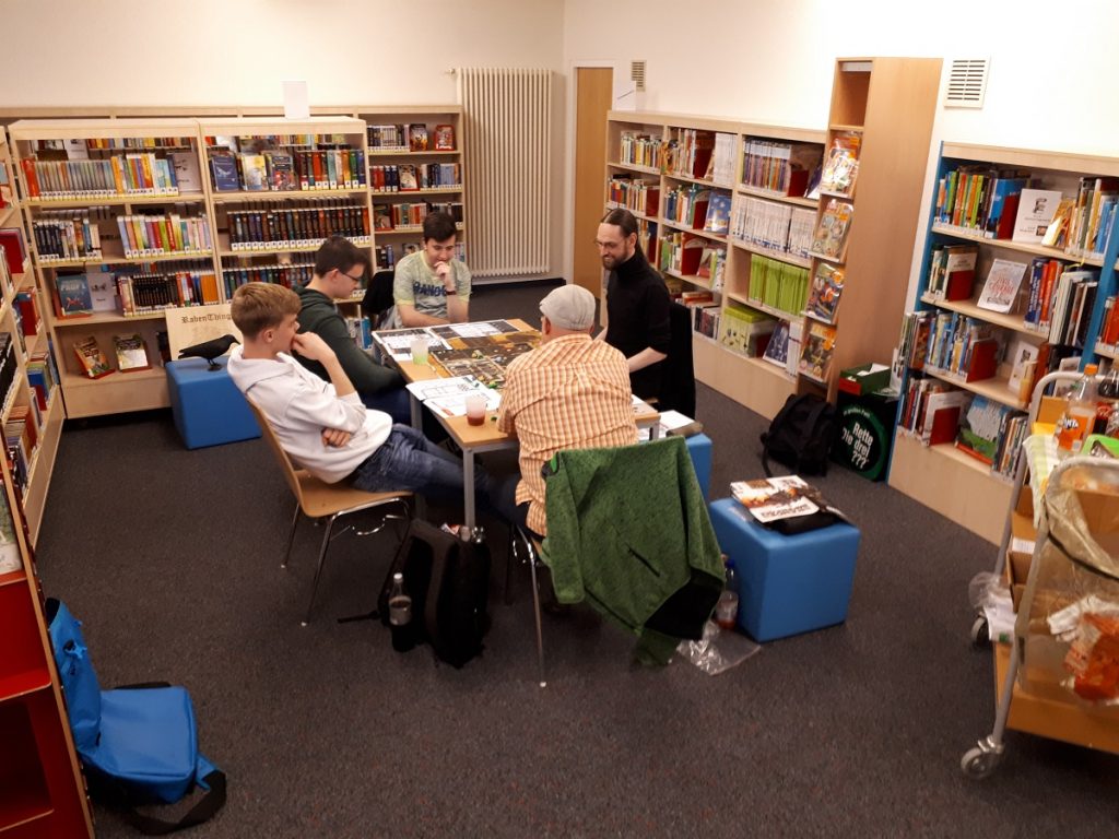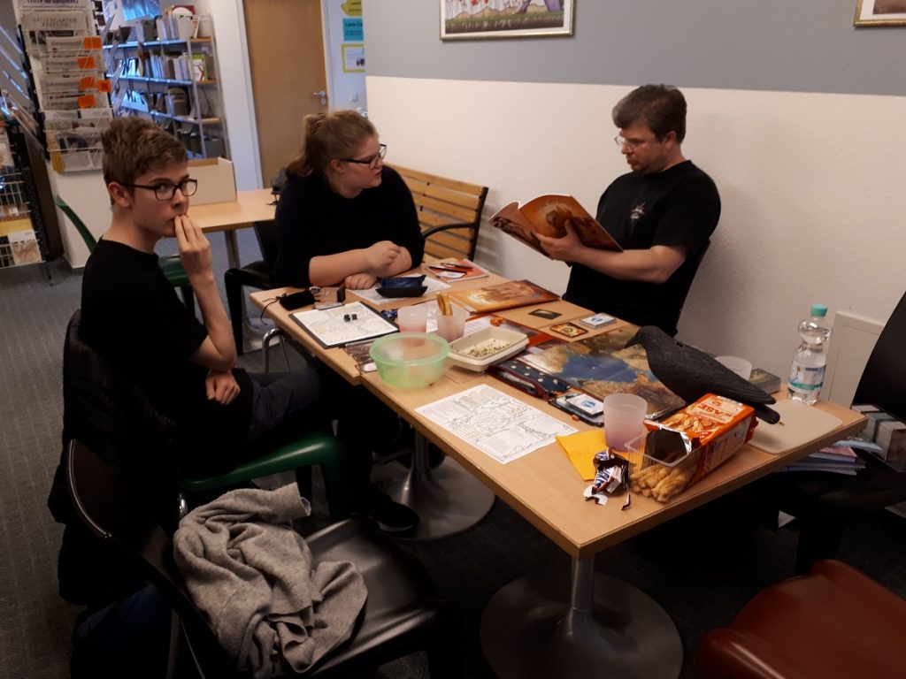 Nach eine kurzen Aufwärmphase ging es aber in allen Runden richtig rund. Der Abend war bis 21:30 angesetzt. Aber keine wollte gehen, bevor sein Abenteuer nicht fertig war. Somit verließen die SpielerInnen und Spielleiter die Bibliothek nicht vor 22:00 Uhr.