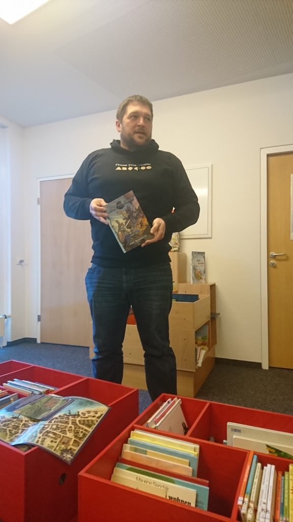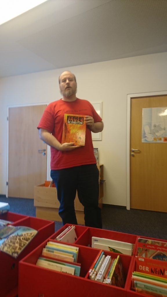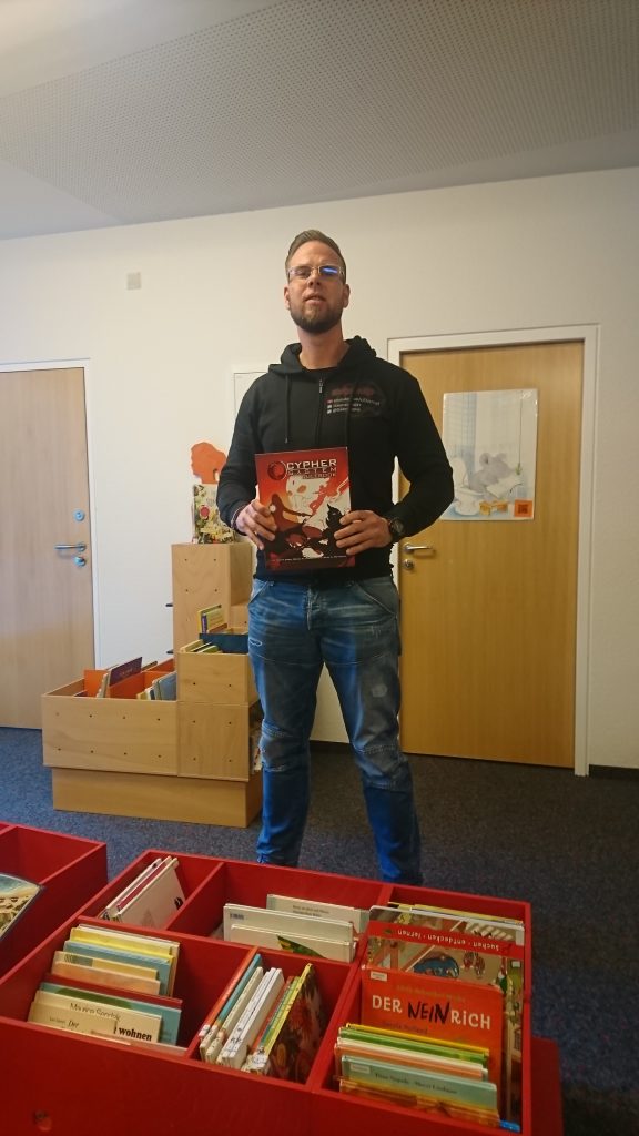 Aber zunächst haben wir noch eine Spende vom Donnerhaus übergeben dürfen. Das Donnerhaus hatte mitte des Jahres eine große Spendenaktion gestartet, um dem ins Straucheln gekommenen Uhrwerk-Verlag zu helfen. Nun begab es sich, dass wir eine Anfrage vom Donnerhaus bekamen, ob wir bei unserem Event eine kleine Spende überreichen wollen, die wir auch noch selbst aus dem Uhrwerk-Katalog aussuchen dürfen. Wie toll ist das denn!!!! Coriolis ist nun eine super Ergänzung zu dem Material, das die Bibliothek bereits zum Verleih angeschafft hat: