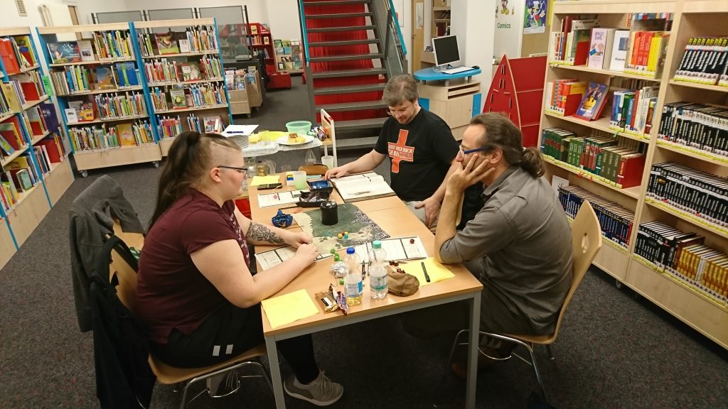 Nun haben wir bereits zum zweiten mal die Bibliothek in Calw mit unseren Rollenspielen besucht und über 30 Besucher folgten unserem Ruf. Diesmal war der Termin auf den Samstag gelegt, so dass wir ab 15:00 Uhr mehr als fünf Stunden zum Spielen hatten. Und das war auch nötig…